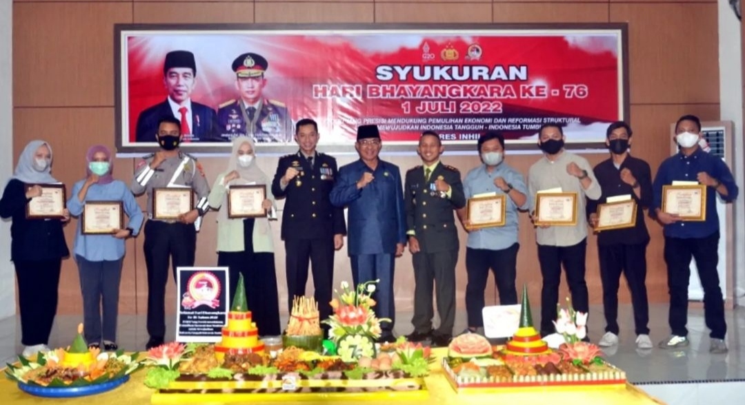 Sementara puncak acara syukuran dalam rangka hari Bhayangkara ke - 76 di Mapolres Indragiri Hilir dilanjutkan dengan pemotongan dan penyerahan tumpeng dan penyerahan piagam untuk Polisi berprestasi serta pemenang lomba foto oleh Bupati dan Kapolres Indragiri Hilir.