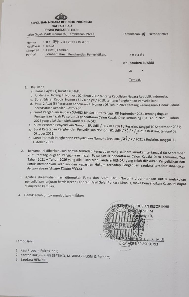 Sebelumnya, Hendri telah dilaporkan ke Polres Inhil dengan dugaan menggunakan Ijazah Palsu untuk mencalonkan diri sebagai Kepala Desa Kemuning Tua, Kecamatan Kemuning.