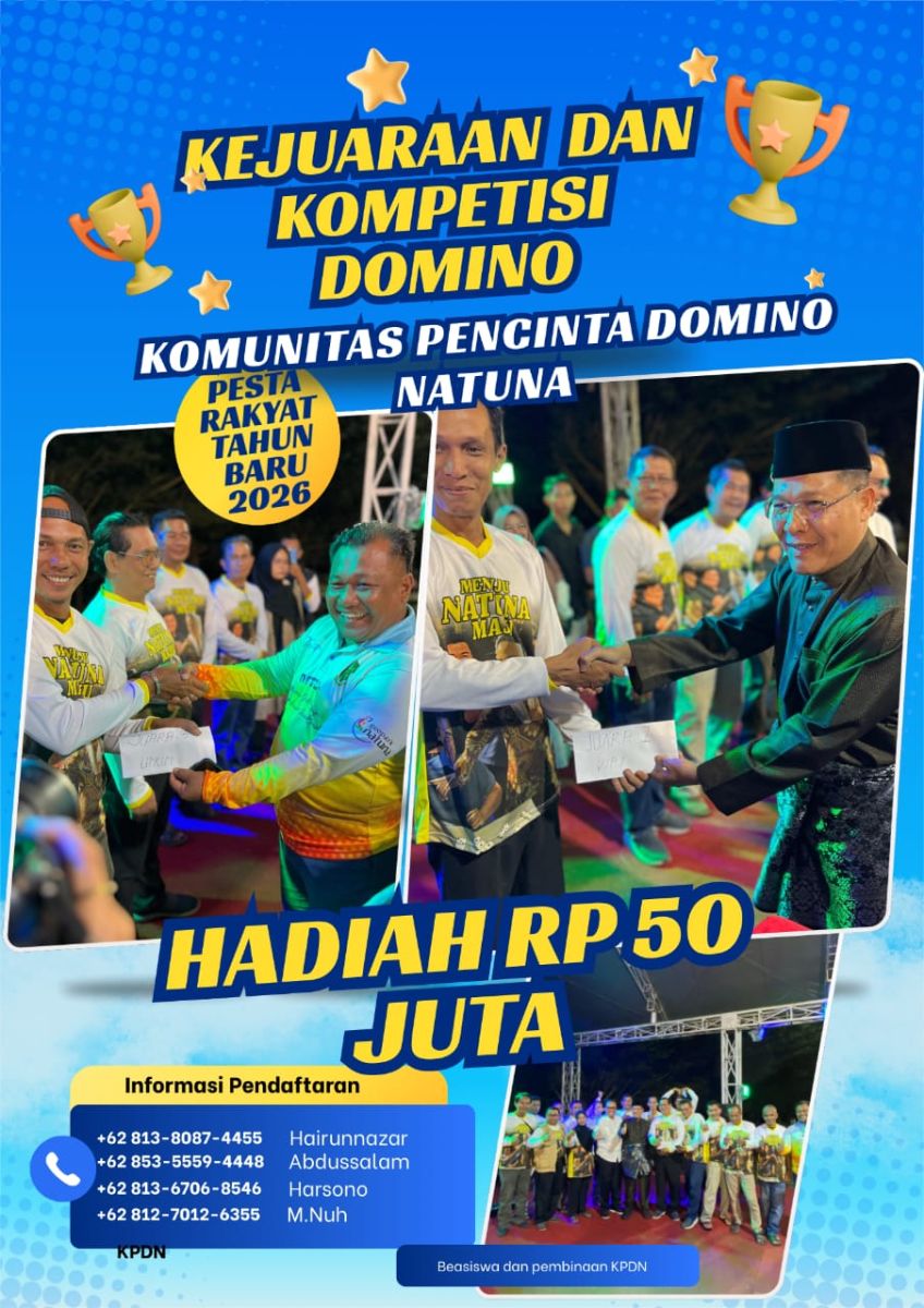 Kejuaraan Domino Natuna Tahun Baru 2026 menjadi bagian dari dua agenda besar KPDN, yaitu penyambutan Tahun Baru 2026 serta pengukuhan pengurus KPDN yang direncanakan berlangsung pada 7 Januari 2026.