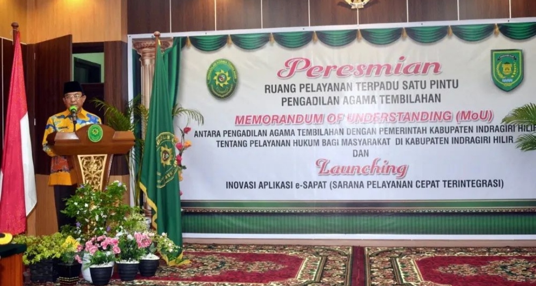 Resonansi.co - Bupati Indragiri Hilir H. M. Wardan bersama Ketua Pengadilan Tinggi Agama Pekanbaru DR . H. Harun . S , SH , MH meresmikan Ruang Pelayanan Terpadu Satu Pintu ( RPTSP ) PA Tembilahan sekaligus menandatangani MoU antara Pemda dengan PA Tembilahan tentang pelayanan hukum bagi masyarakat Tembilahan serta melakukan launching inovasi aplikasi e - Sapat ( Sarana Pelayanan Cepat Terintegrasi ) dan meresmikan PTSP . PA Tembilahan , Kamis (08/09/2022).