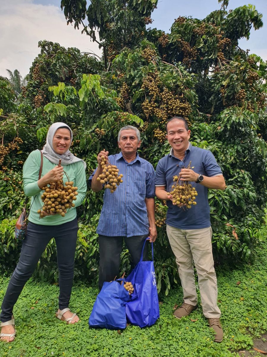 Pemilik Klaster Agrowisata Gandung Farm, Parjiyono (tengah) bersama Perwakilan BRI RO Pekanbaru saat panen buah Lengkeng, Rabu (9/10/2024) lalu. (GANDUNG FARM/ RESONANSI.CO).