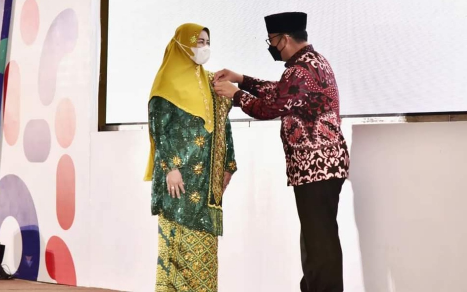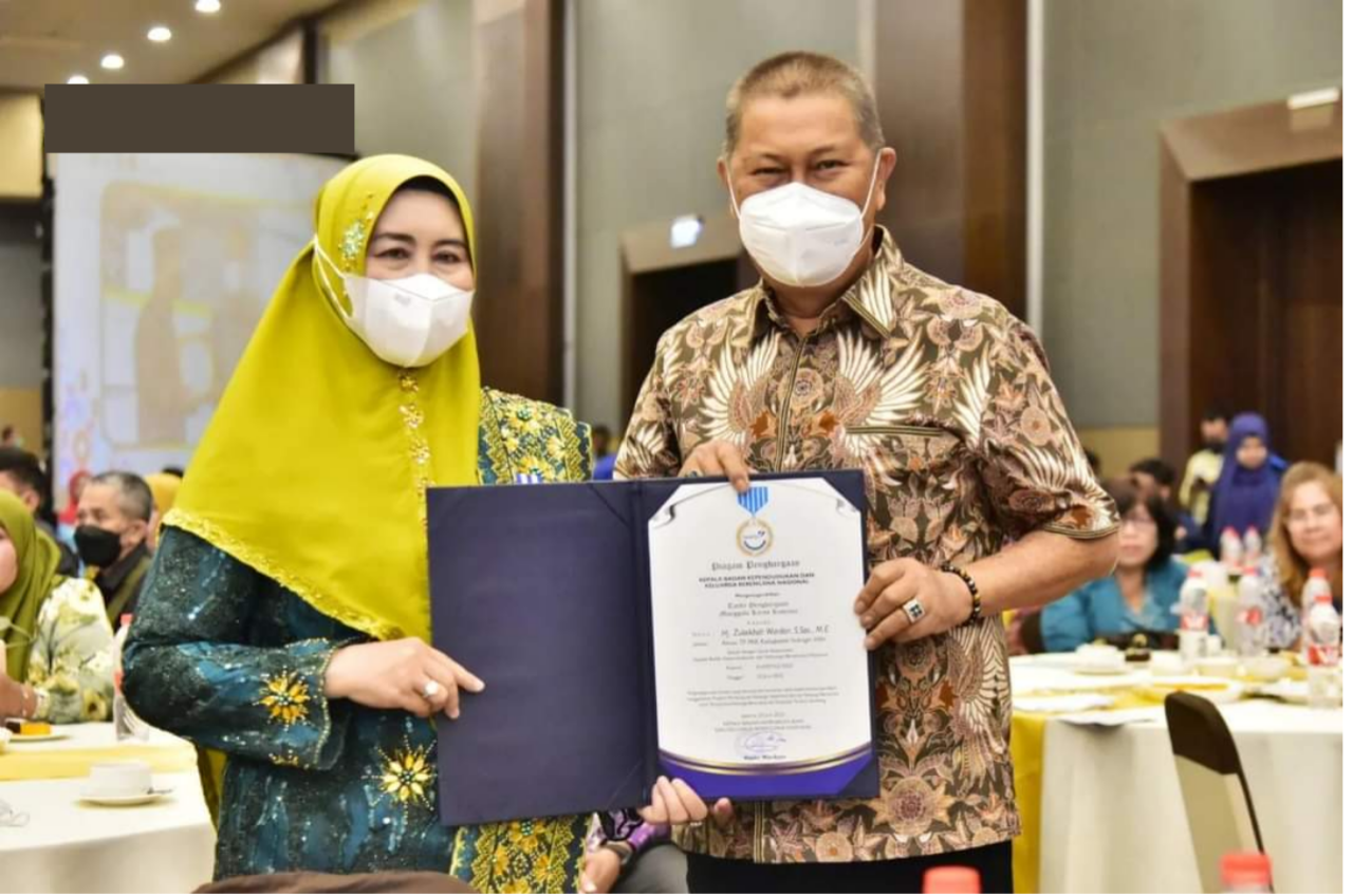 Hj. Zulaikhah Wardan, Ketua Tim Penggerak dan Pemberdayaan Kesejahteraan Keluarga (TP-PKK) Kabupaten Indragiri Hilir menerima secara langsung Tanda Penghargaan Manggala Karya Kencana (MKK) dari Kepala BKKBN yang dilaksanakan di Hotel Santika, Medan, Rabu (6/7/2022) siang.